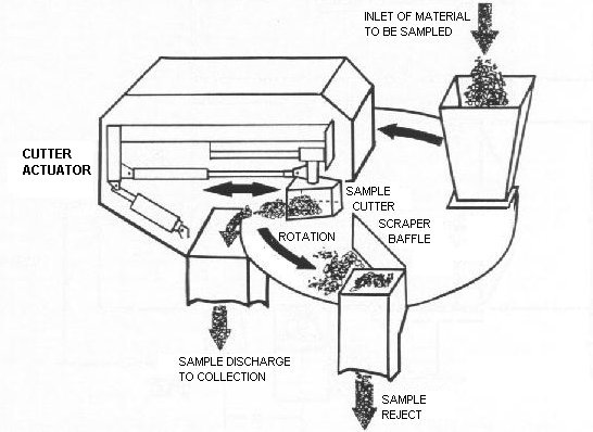The ROTARY TABLE SAMPLER enables efficient sampling of powders and solid materials including moist concentrates and other material having tendencies toward sticking to chute surfaces when using trajectory or top-belt sampling. The rotary table method also is efficient for sampling fine powders by avoiding sample bias resulting from fines classification occurring with gravity flow sampling. It is used for secondary or tertiary sampling, or for primary sampling of relatively small flows. The ROTARY TABLE SAMPLER operates by feeding material from a supply bin fitted with a gate to form a continuous mound of material to be sampled. Material flows from the bin in a circular path as the table rotates under the bin to draw material out. Representative samples of material are taken from this mound with a sample extractor (electrical or pneumatic actuators may be selected). The table rotation is effected by a gearmotor drive through a tooth belt pulley system for table operation typically in the range of 0.5 to 5 RPM. The adjustable height bin gate enables a constant rate flow of material feed from the bin onto the rotating plate. The moving mound of material being processed is retained within a specified band width by aprons positioned above the plate. Remaining solids (reject) after sample extraction are pushed off the plate by a fixed discharge baffle as the mound continues in rotation on the plate. Periodic extraction of sample increments from the flow are taken by cutter mechanical action as it is pushed down to the table surface through the mound until the cutter blades reach the table surface. Cutter retraction then removes the increment from the plate into a sample receiver. Cutter operation is sequenced by an electric timer. Table rotation is stopped for a few seconds each time a sample increment is extracted. The cutter is made with sides radial to the center of table rotation so to maintain theoretical rotary sampling technique for through-stream extraction. The method assures accurate representation of the process stream in extracted samples. The ROTARY TABLE SAMPLER concept combines uniform feeding of solids with requirement for minimum elevation to install the sampler. A linear sampling configuration by this concept can also be provided using a continuous flat belt feeder. A timer-starter control unit Model PB-200 series is available for operation of a single sampler, or alternatively operation can be carried out with a centralized control system. |